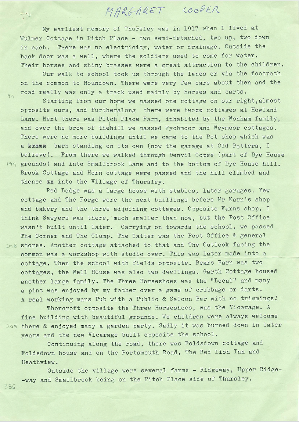 This from Margaret Cooper (née Gale) who, as a young girl, was at Thursley School in 1920: