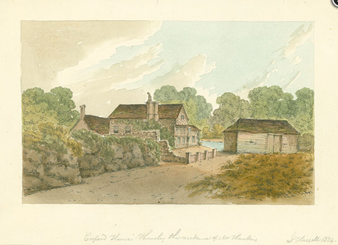 John Hassell (1767-1825) is remembered today as a watercolour painter, engraver and drawing master. He was born in 1767, perhaps in Wales, and first appeared as an exhibitor at the Royal Academy in 1789. He was a popular drawing-master and published several works on the techniques of drawing and painting in watercolour. He also published books of topographical views which owe much to the romantic interest in the picturesque. Several of these books, notably his ‘Views of Gentleman’s Seats Adjacent to London‘ (1804-1805), ‘Picturesque Rides and Walks within Thirty Miles of the British Metropolis‘ (1817-1818) and ‘Excursions of Pleasure‘ (1823) show Hassell’s deep interest in Surrey which was to take him to most parts of the county and result in at least 750 watercolour views of churches, houses and other buildings of architectural or historical interest which he found. They provide a superb glimpse of the county’s architecture over two centuries ago before the face of Surrey was transformed by the coming of the railway.