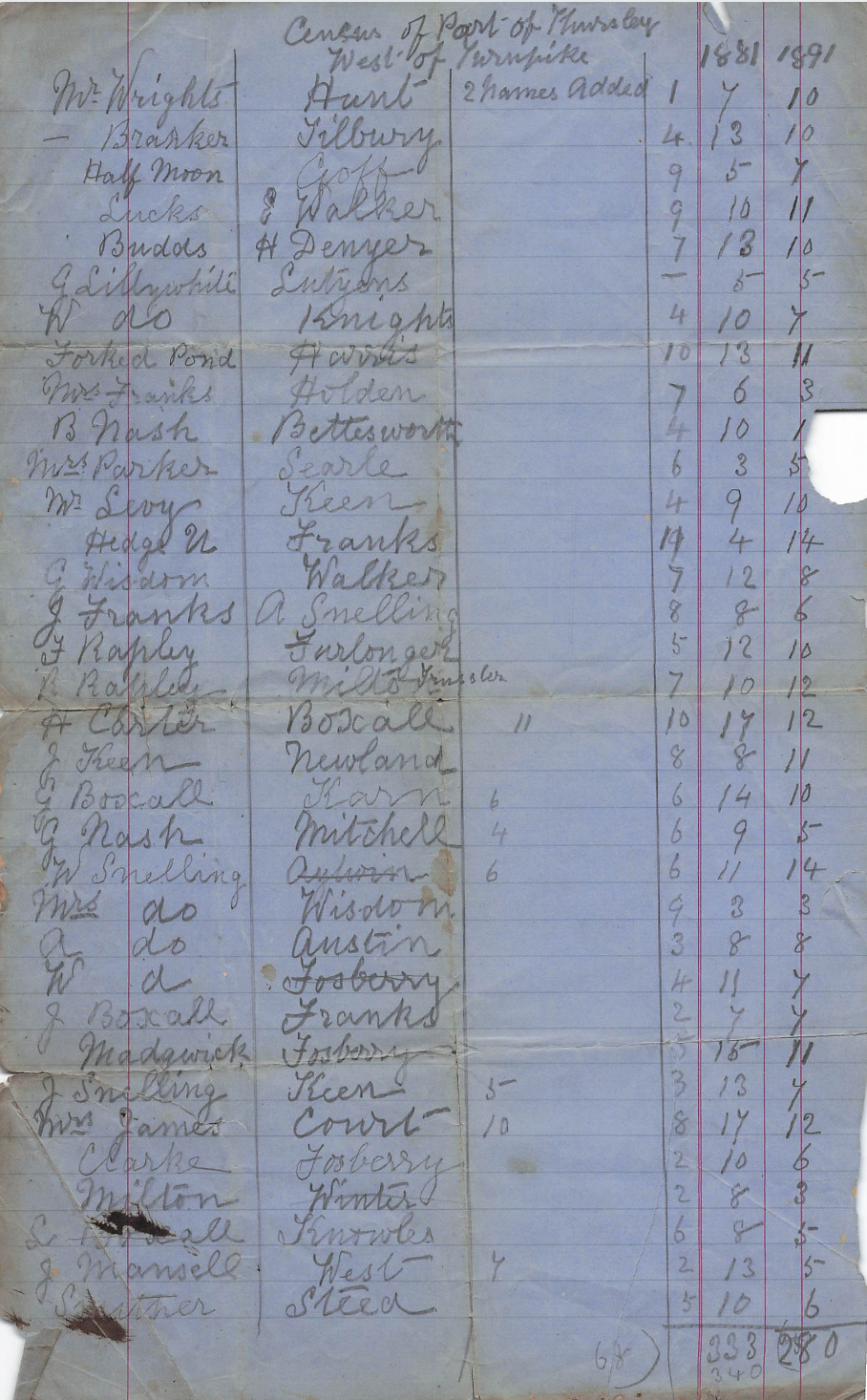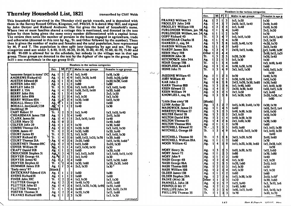 Unfortunately, the Thursley Household List, 1821, shows only the names of the villagers but at least it provides a great deal of demographic information: