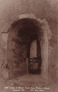 "Pre-Conquest windows were discovered during aggressive restoration by Ferry in 1860; a triangular recess in the chancel has been interpreted as a Saxon oven for baking wafers. The nave is dominated by the timber cage supporting an impressive 15th-century wooden bell-turret"